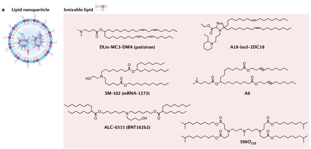DODAP和DODMA是第一种用于RNA输送的可电离脂质。通过设计提高DODMA的功效,产生了DLin-MC3-DMA。这是第一个FDA批准的药物制剂中使用的可电离脂质:siRNA药物patisiran(Onpattro)。除了有效且安全地递送siRNA外,DLin-MC3-DMA还用于mRNA的递送。