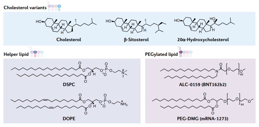 LNPs的聚乙二醇化脂质成分由聚乙二醇(PEG)与锚定脂质(如DMPE或DMG)结合而成。亲水性PEG可以稳定LNP,通过限制脂质融合调节纳米颗粒大小,并通过减少与巨噬细胞的非特异性相互作用增加纳米颗粒半衰期。mRNA-1273和BNT162b2 SARS-CoV-2疫苗均含有聚乙二醇化脂质。