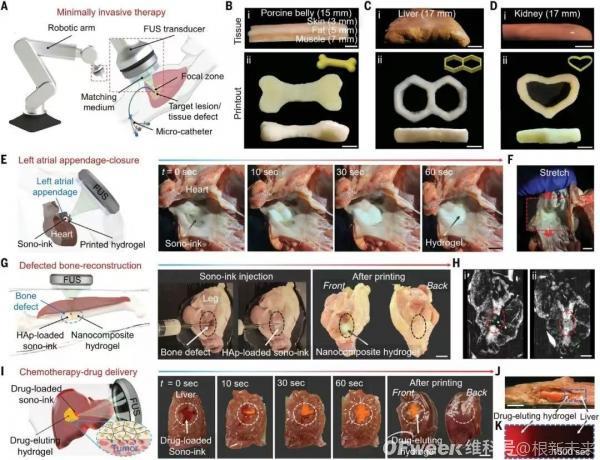 于是,为了克服这一障碍,杜克大学和哈佛医学院的研究团队就提出了一种创新方法,利用超声波,再加上生物相容性的生物墨水,在人体内需要的地方直接完成3D打印。