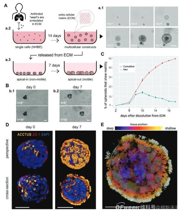 一是采用人的细胞合成,这个很好理解,这个生物机器人,其实就是由人类肺上皮细胞构成的。具体一点来说,就是从人体气管表面提取支气管上皮细胞,这些细胞中包含着支气管上皮祖细胞,这种细胞被称为成体干细胞,是一种在成人体内存在、具有一定分化潜能的特殊细胞。这个生物机器人最独特的地方就在于,它是利用我们人体里已经存在的细胞构造的,而无需进行复杂的基因改造。