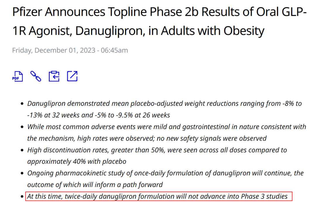 果不其然,时隔半年,Danuglipron被Pfizer按下了暂停键。2023-12-1,Pfizer公布口服 GLP-1 激动剂 Danuglipron (PF-06882961) 治疗成人肥胖症的 Ⅱb 期临床试验初步结果,同时宣布,停止该药每日2次制剂的Ⅲ期临床,转而推进每日1次的Danuglipron制剂优化和开展药代动力学研究。
