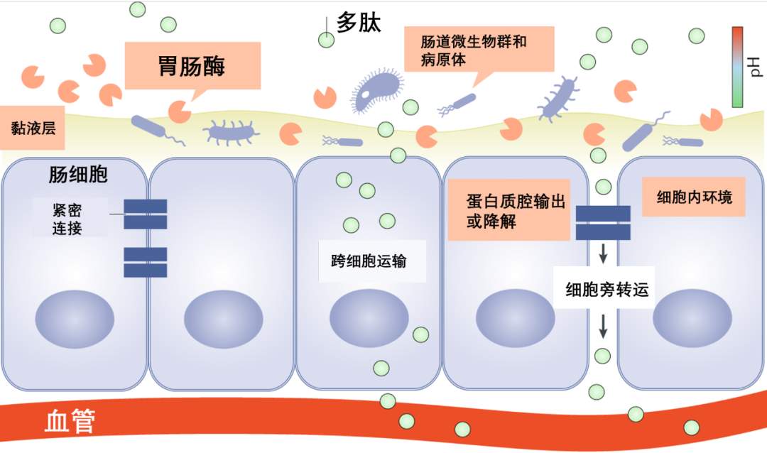 图6. 肠道结构示意图以及对口服多肽吸收的挑战