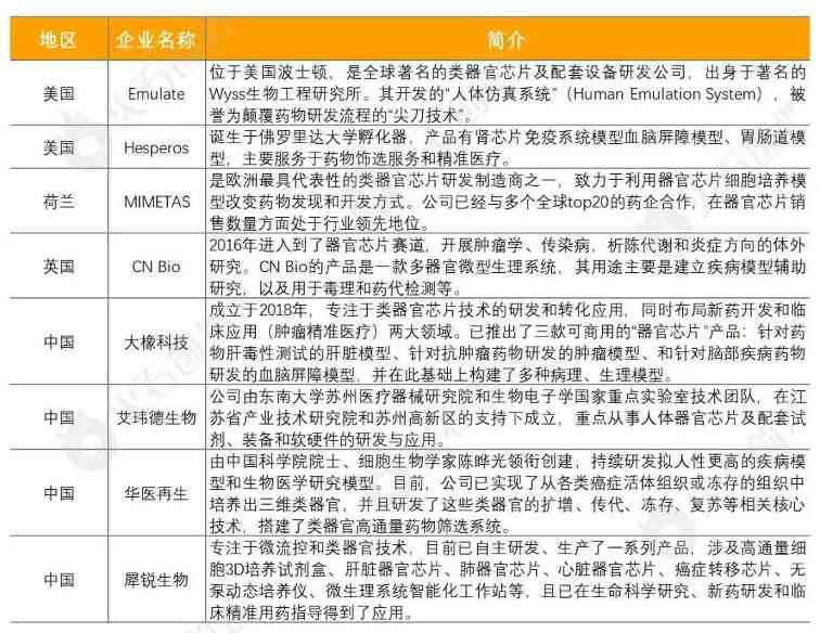表 全球及中国类器官芯片重点企业
