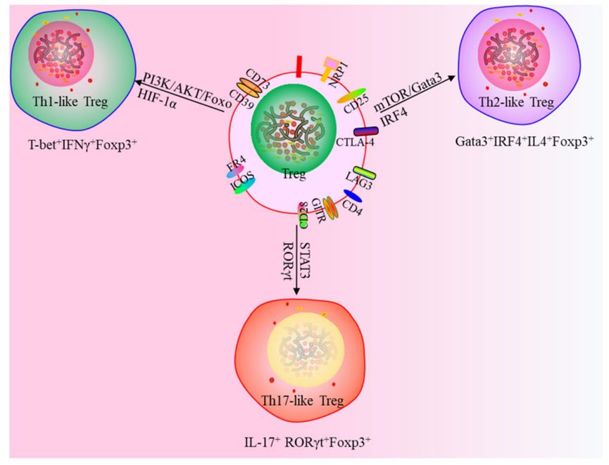 此外,一项研究使用一种新的策略来定义Tregs, Th1样Tregs(T- 234bet+IFNγ+Foxp3+),Th2 样Tregs(Gata3+IRF4+IL4+Foxp3+)和Th17样Tregs(IL-17+RORγt+Foxp3+),这为靶向 Tregs 治疗提供了新思路。