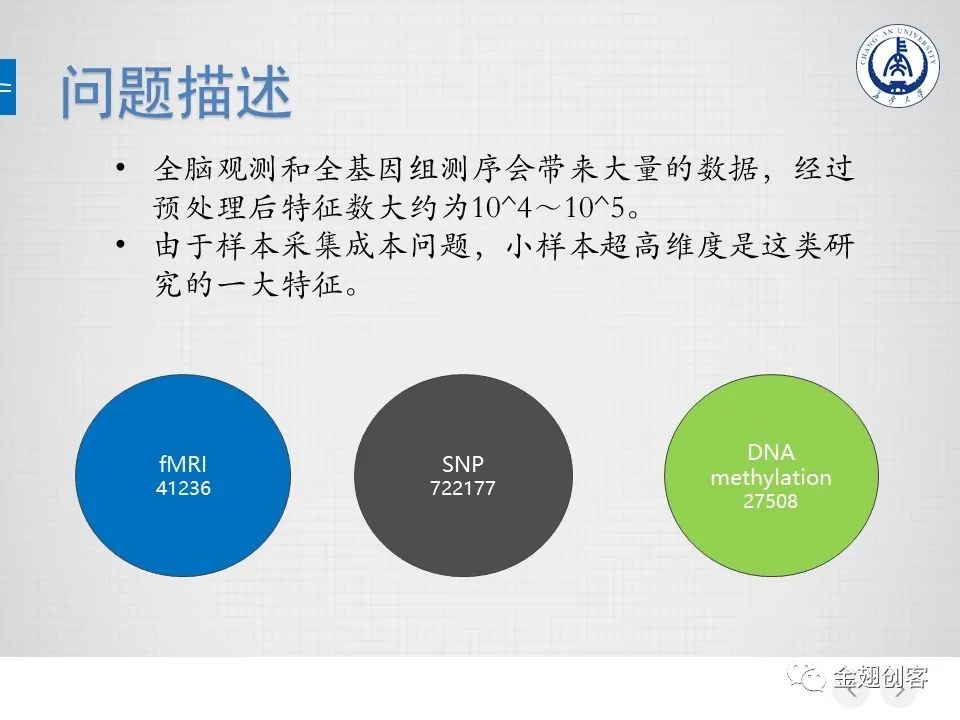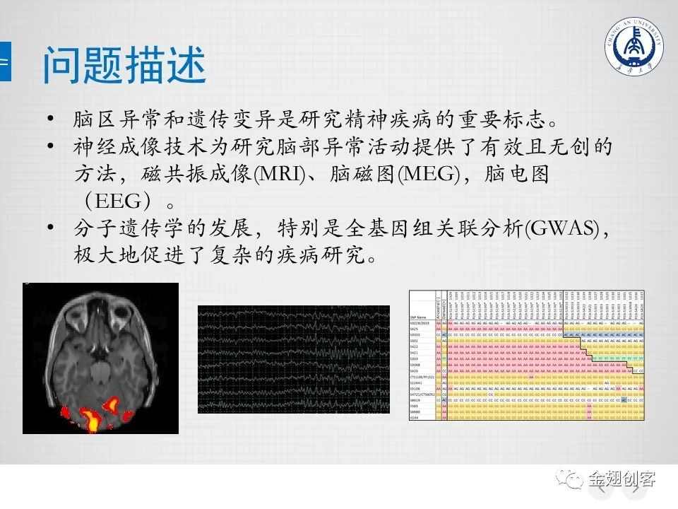 脑区异常和遗传变异是研究精神疾病的重要标志。神经成像技术为研究脑部异常活动提供了有效且无创的方法,如磁共振成像(MRI)、脑磁图(MEG),脑电图(EEG)。随着分子遗传学的发展,特别是全基因组关联分析(GWAS),极大地促进了复杂的疾病研究。影像遗传学通过多种影像和遗传数据融合,识别与神经成像内表型和遗传变异相联系的生物标记物,从而为精神疾病诊断及其亚型的分类提供帮助。由于样本采集成本问题,小样本超高维度是这类研究的一大特征。如此规模的数据计算问题自然的成为了一大难点。