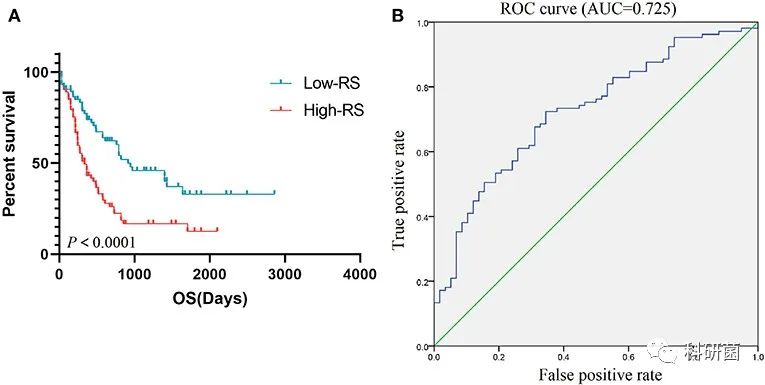 随后根据中位数将163例AML患者分为低RS组和高RS组,进行生存分析,研究不同RS水平与总体生存率之间的关系。结果表明,高RS与不良的总生存期有关(图7A)。然后绘制ROC曲线,并计算曲线下面积AUC为0.725,显示出RS对总体生存率的预测准确性较高(图7B)。