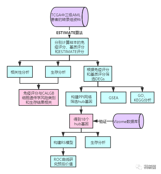 通过ESTIMATE算法计算免疫,间质和ESTIMATE得分,并以此筛选DEGs,进行生存分析、KEGG、GO、GSEA分析,构建PPI网络并筛选hub基因,最后通过构建风险评分(RS)模型,研究hub基因的预后价值并用验证集进行验证。