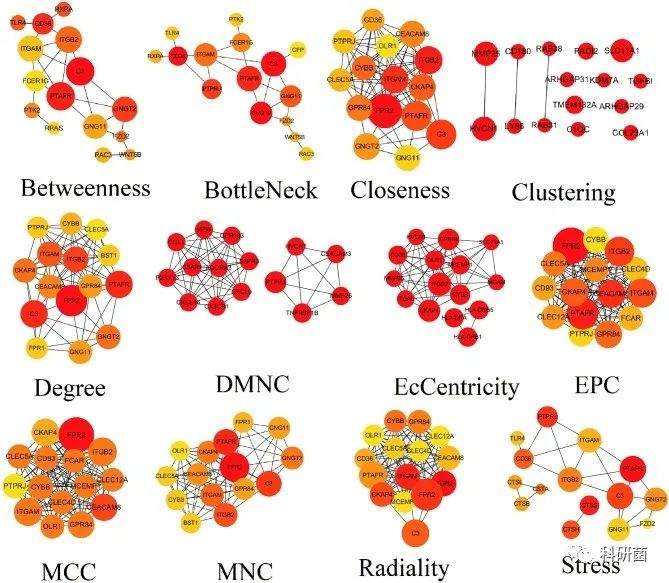 图5 cytoHubba插件基于12种算法进行hub基因识别