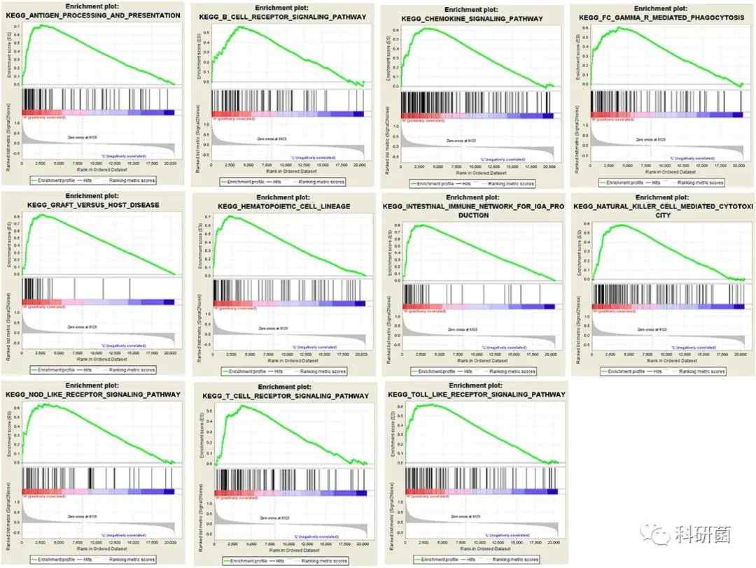 GSEA的结果表明:抗原加工和呈递,B细胞受体信号传导通路,趋化因子信号传导通路,FcγR介导的吞噬作用,移植物与宿主疾病,造血细胞谱系,产生IgA的肠道免疫网络,NK细胞介导的细胞毒性,NOD样受体信号传导通路,T细胞受体信号传导通路和Toll样受体信号传导通路是肿瘤免疫相关交叉基因富集的主要通路(图6)。