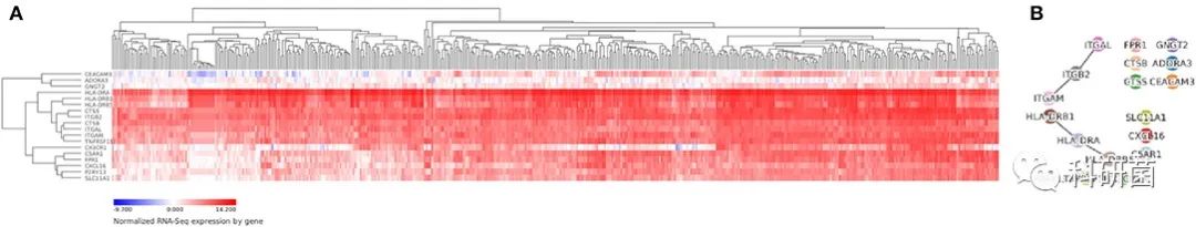 Vizome是最大的AML数据库,它包含了从562名患者收集的672份肿瘤样本的全外显子组测序数据。验证了Vizome数据库中hub基因的表达水平。热图显示,18个hub基因在数据库中的样本中表现出高表达(图9A)。图9B中还显示了其中4个hub基因的相互作用关系。