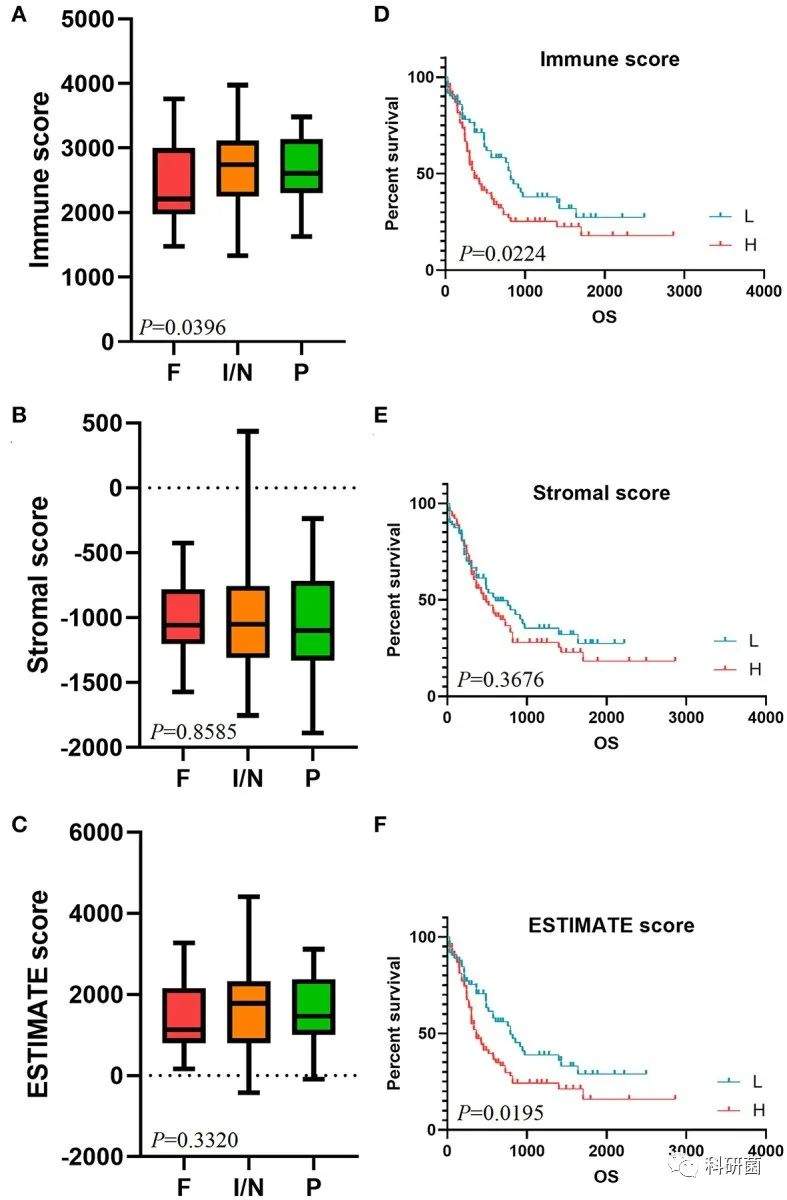 免疫评分和ESTIMATE评分越高,总体生存情况越差(分别为P=0.0224,P=0.0195,图1D,F)。