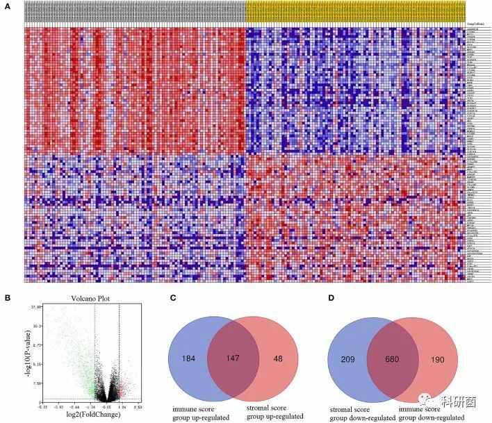 将免疫评分和基质评分按中位数分为高组和低组,分别绘制基因表达热图(图2A,图3A)。并根据免疫评分和基质评分的高低组分别筛选DEGs(PFDR < 0.05 , |log2FC| > 1),绘制火山图(图2B,图3B)。通过Venn图对两组获得的DEGs取交集。
