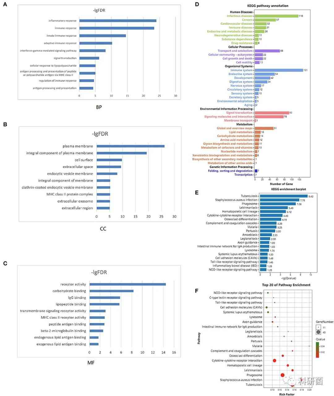 在KEGG通路注释(图4D)和富集分析(图4E)中,主要是与免疫、癌症和结核病相关的通路。通路富集分析的前20条结果如图4F所示。