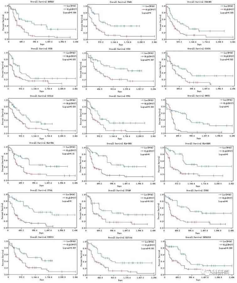 此外,还绘制了18个hub基因的生存曲线,以探讨预后价值(图8)。结果显示,hub基因的高表达水平与不良的总体生存率有关。