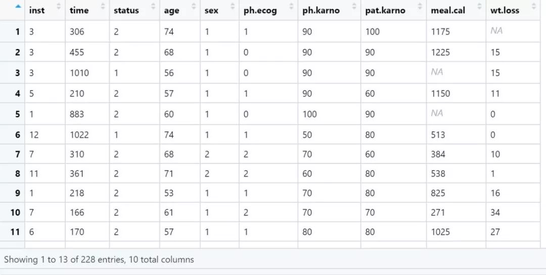 time:患者生存时间,单位是days?status:患者结局,1表示删失,2表示死亡 其余变量:自变量,比如:age表示年龄,sex表示性别等等