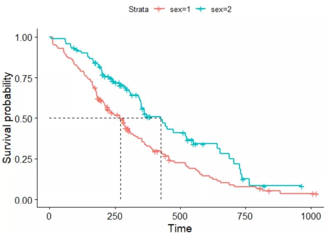 # 添加中位生存ggsurvplot(fit, data = lung, surv.median.line = "hv")