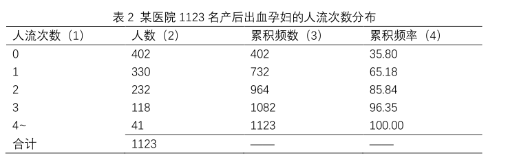 频数分布(frequency distribution) 通常是针对样本而言。对于连续变量(continuous variable),频数分布为n个变量值在各变量值区间内的变量值个数的分配[表1第(1)栏和第(2)栏]。对于离散变量(discrete variable),频数分布为n个变量值在各(或各几个)变量值处的变量值个数的分配[表2第(1)栏和第(2)栏]。