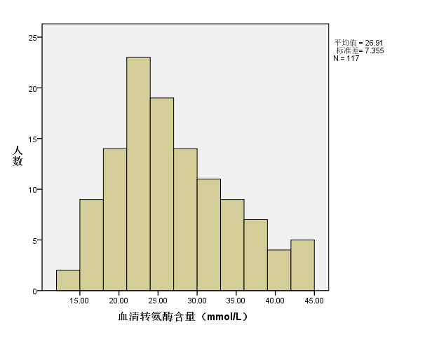图2:117名正常成年女子血清转氨酶的频数分布直方图