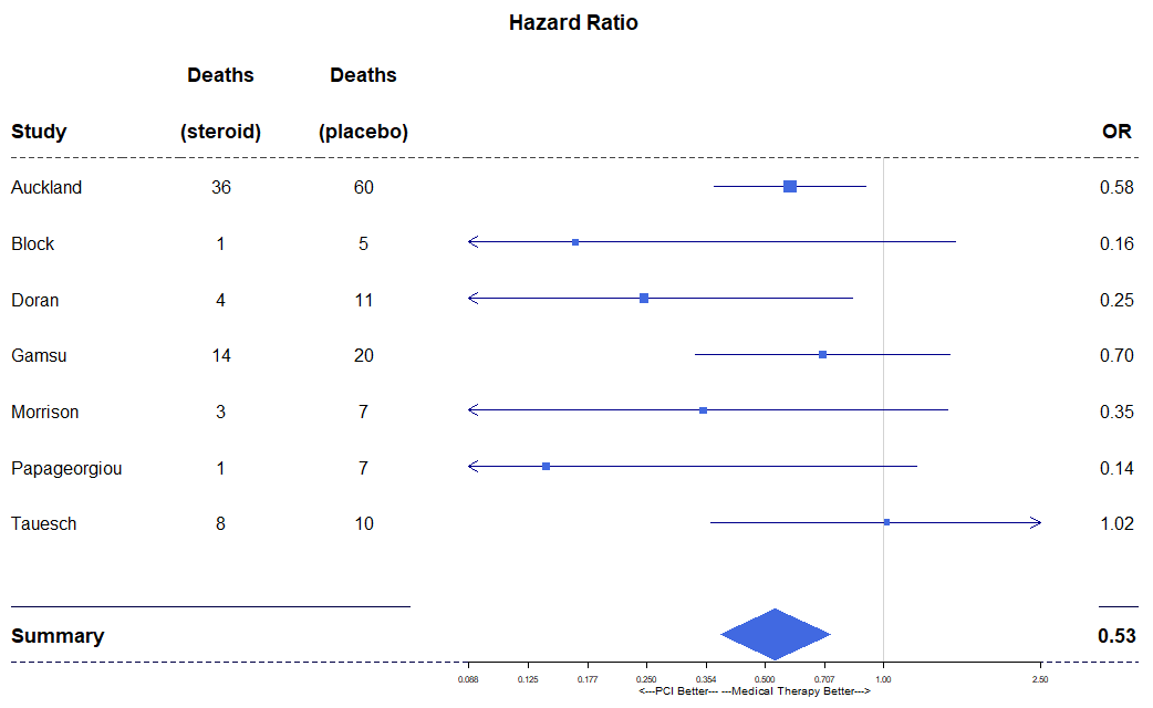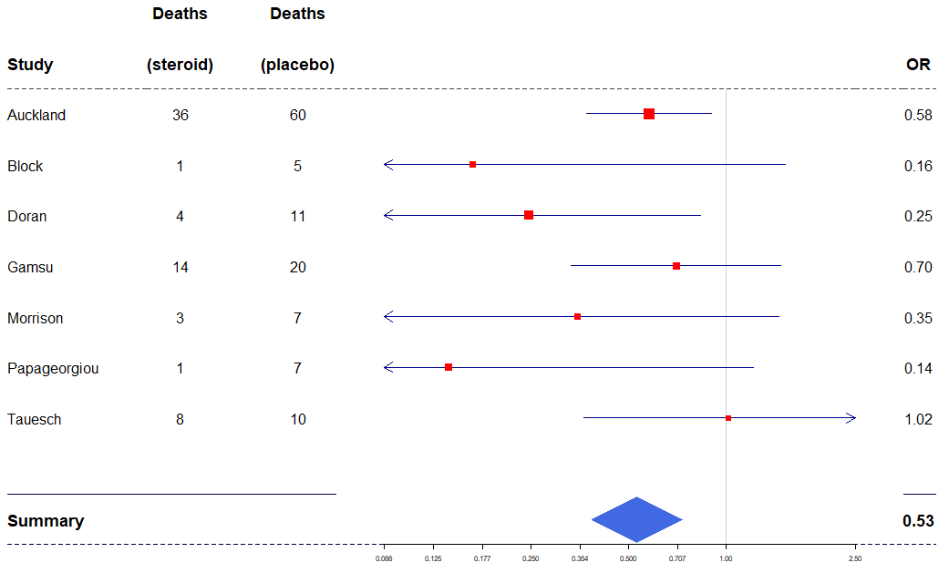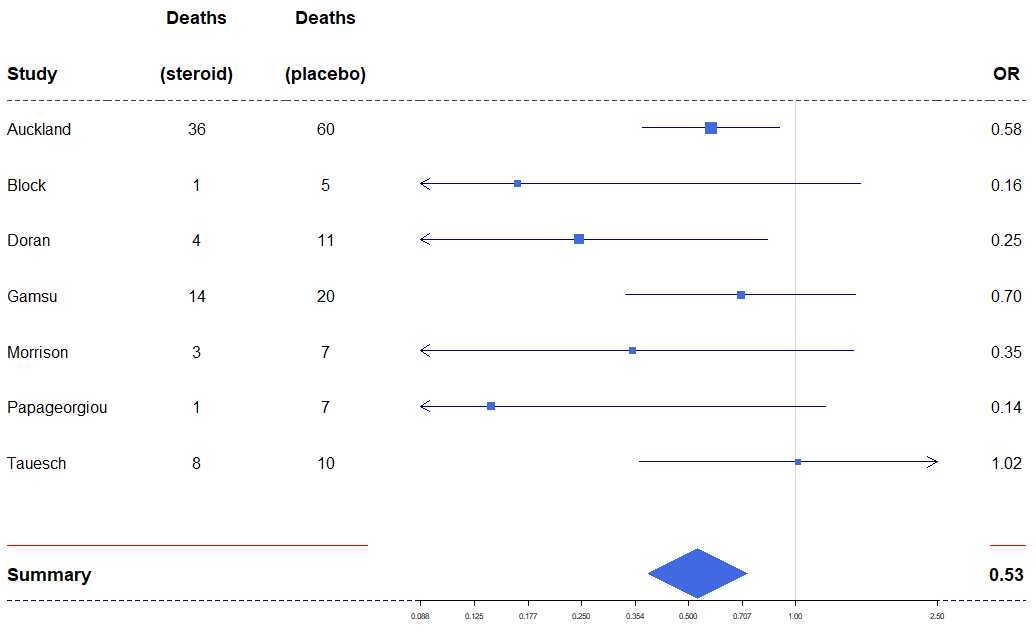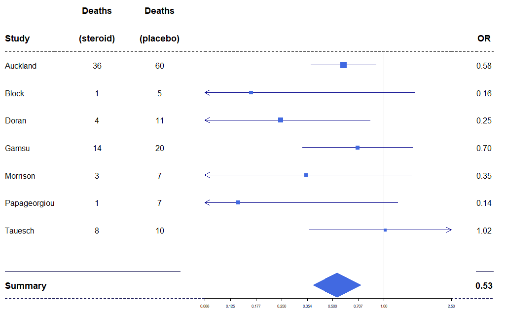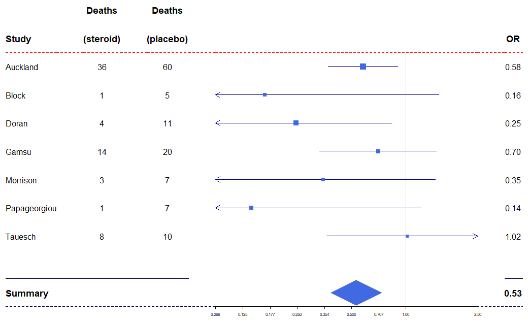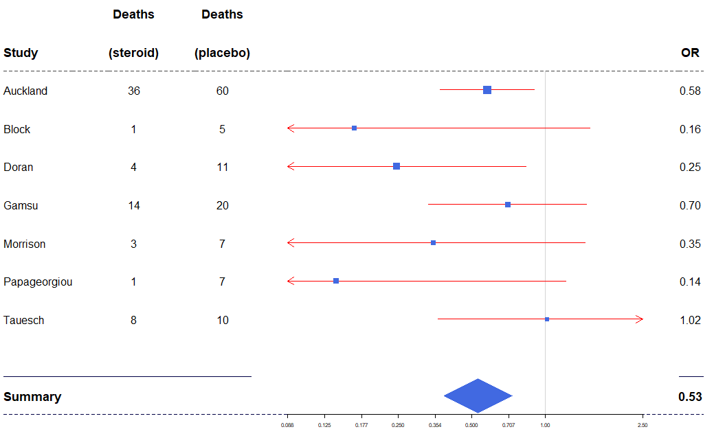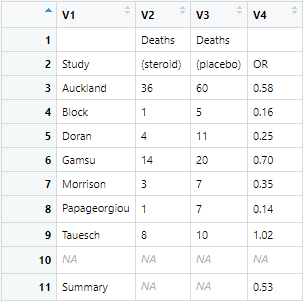 tabletext<-cbind(c("", "Study", "Auckland", "Block","Doran", "Gamsu", "Morrison", "Papageorgiou","Tauesch", NA, "Summary"),c("Deaths", "(steroid)", "36", "1","4", "14", "3", "1","8", NA, NA),c("Deaths", "(placebo)", "60", "5","11", "20", "7", "7","10", NA, NA),c("", "OR", "0.58", "0.16","0.25", "0.70", "0.35", "0.14","1.02", NA, "0.53"))