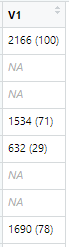 # 构建tabletext,更改列名称,将 count 和 percent 合并np <- ifelse(!is.na(data$Count), paste(data$Count," (",data$Percent,")",sep=""), NA)View(np)