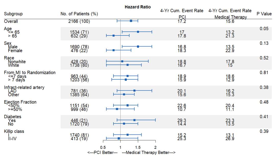 png(filename = "Forestplot.png",width=960, height=640)forestplot(labeltext=tabletext, graph.pos=3, #为Pvalue箱线图所在的位置 mean=c(NA,NA,data$Point.Estimate), lower=c(NA,NA,data$Low), upper=c(NA,NA,data$High), title="Hazard Ratio Plot", #定义标题 xlab=" <---PCI Better--- ---Medical Therapy Better--->", #定义x轴 ##根据亚组的位置,设置线型,宽度造成“区块感” hrzl_lines=list("3" = gpar(lwd=1, col="black"), "7" = gpar(lwd=60, lineend="butt", columns=c(2:6), col="#99999922"), "15" = gpar(lwd=60, lineend="butt", columns=c(2:6), col="#99999922"), "23" = gpar(lwd=60, lineend="butt", columns=c(2:6), col="#99999922"), "31" = gpar(lwd=60, lineend="butt", columns=c(2:6), col="#99999922")), #fpTxtGp函数中的cex参数设置各部分字体大小 txt_gp=fpTxtGp(label=gpar(cex=1.25), ticks=gpar(cex=1.1), xlab=gpar(cex = 1.2), title=gpar(cex = 1.2)), col=fpColors(box="#1c61b6", lines="#1c61b6", zero = "gray50"), ##fpColors函数设置颜色 zero=1, #箱线图中基准线的位置 cex=0.9, lineheight = "auto", colgap=unit(8,"mm"), lwd.ci=2, boxsize=0.5, #箱子大小,线的宽度 ci.vertices=TRUE, ci.vertices.height = 0.4) #森林图可信区间两端添加小竖线,设置高度dev.off()