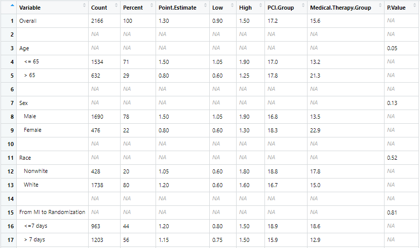 head(data)# Variable Count Percent Point.Estimate Low High PCI.Group Medical.Therapy.Group P.Value# 1 Overall 2166 100 1.3 0.90 1.50 17.2 15.6 NA# 2 NA NA NA NA NA NA NA NA# 3 Age NA NA NA NA NA NA NA 0.05# 4 <= 65 1534 71 1.5 1.05 1.90 17.0 13.2 NA# 5 > 65 632 29 0.8 0.60 1.25 17.8 21.3 NA# 6 NA NA NA NA NA NA NA NA