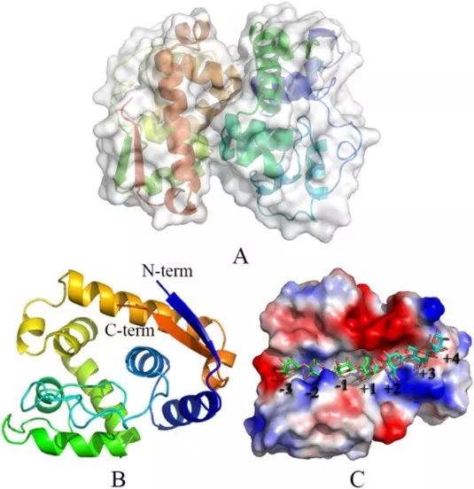 β-1,4-甘露聚糖酶(EC 3.2.1.78)是一种内切酶,广泛分布在低等动物,植物和微生物的胞外分泌物中。与外切酶不同,β-1,4-甘露聚糖酶随机水解甘露聚糖主链内的 β-1,4-糖苷键,产生甘露寡糖。根据其氨基酸序列,β-1,4-甘露聚糖酶在CAZy数据库中分为糖苷水解酶(GH)5、26、113和134家族。在GH 5、26和113家族中,所有β-甘露聚糖酶均具有典型的(β/α)8 TIM-桶蛋白折叠结构,并具有保留催化机制。近来,在构巢曲霉中发现了一种 β-甘露聚糖酶,通过进行性质研究将其归类为新的GH134家族。随后对来自链霉菌属的GH134家族β-甘露聚糖酶Ss GH134进行了结构解析,发现在其催化域中具有至少五个子位点的独特构型。Ss GH134显示出转化催化机理,与报道的其他β-甘露聚糖酶和β-甘露糖苷酶完全不同。迄今为止,仅有一个GH134家族成员的晶体结构被报道,但底物结合机制尚不明确。