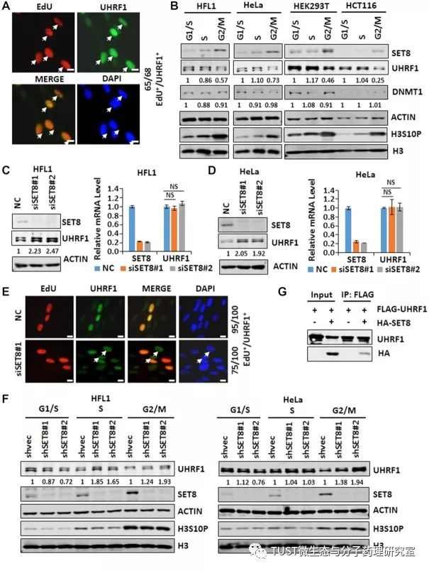 以前的许多研究都集中在调节DNMT1的表达及其对DNA甲基化的活性。例如,DNMT1的稳定性和活性已显示受翻译后修饰的调控,包括磷酸化、乙酰化和甲基化以及通过RNA。然而,关于通过调节UHRF1来控制DNA甲基化的研究较少。在这方面,作为募集和激活DNMT1的因素,UHRF1可能是DNA甲基化调控的更敏感靶标。最近的研究已经确定,UHRF1是重编程幼稚胚胎干(ES)细胞和卵子发生过程中整个DNA甲基化的关键靶标。在体细胞中,已知S期UHRF1的高表达与细胞增殖有关,并且通常在癌细胞中被解除控制。然而,目前尚不清楚UHRF1在体细胞中是如何调控、确保在细胞分裂中DNA甲基化的忠实遗传的。
