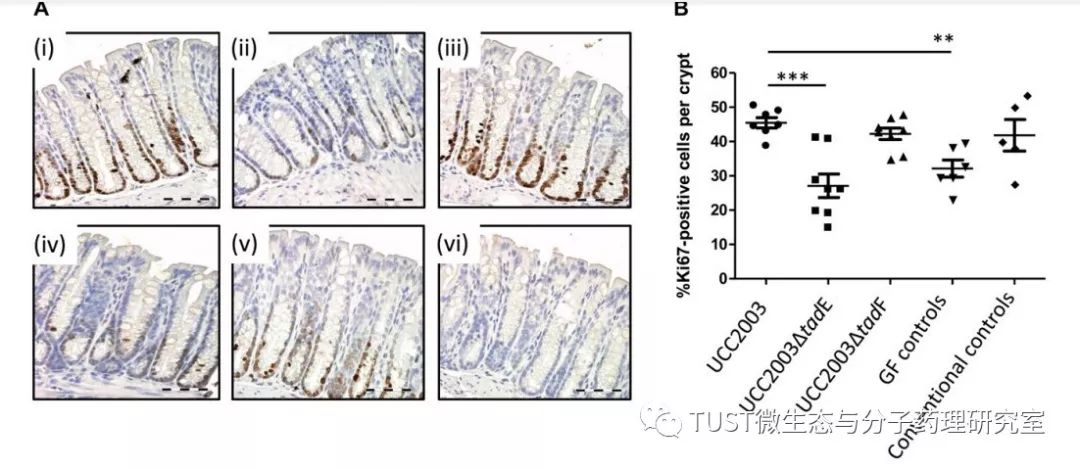 人肠道微生物群的发育开始于出生之时。某些双歧杆菌是新生胃肠道的主要和早期定植者。目前,双歧杆菌定植的分子基础、持久性与宿主的机制仍然模糊不清。本文作者之前发现来自短双歧杆菌UCC2003的紧密粘连(Tad)菌毛是一种重要的定植因子。在本文中,作者们证明双歧杆菌Tad菌毛也会促进体内结肠上皮细胞增殖。在短双歧杆菌UCC2003给药后5天,可以检测到细胞增殖显著增加。应用功能基因组方法,本研究构建了可以产生Tad2003菌毛或缺乏TadE或TadF假丝氨酸的细菌菌株。对这些突变菌株在体内促进上皮细胞增殖的能力的分析表明,菌毛蛋白亚基TadE是负责该增殖反应的双歧杆菌分子。使用纯化的TadE蛋白在体外也证实了这些发现。该研究表明:双歧杆菌Tad菌毛可能通过产生特定的细胞外蛋白促进早期肠道的成熟,刺激新生儿粘膜的生长。
