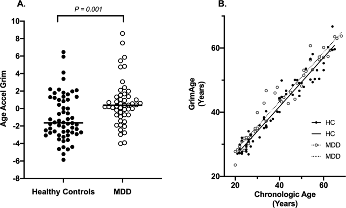 研究人员从49名在研究前未服用药物的MDD患者和60名同龄健康对照受试者中收集了血样。他们使用GrimAge时钟分析了两组的甲基化率。虽然有许多基于甲基化的寿命算法,但GrimAge是唯一一个专门基于与死亡率相关的甲基化模式的算法。