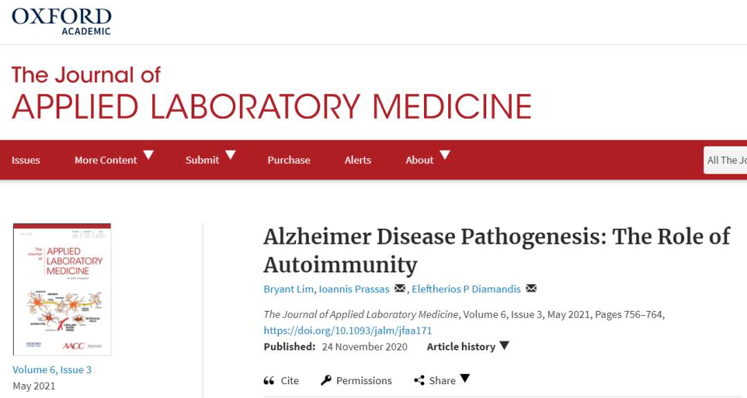 Bryant Lim, Ioannis Prassas, Eleftherios P Diamandis, Alzheimer Disease Pathogenesis: The Role of Autoimmunity, The Journal of Applied Laboratory Medicine, Volume 6, Issue 3, May 2021, Pages 756–764