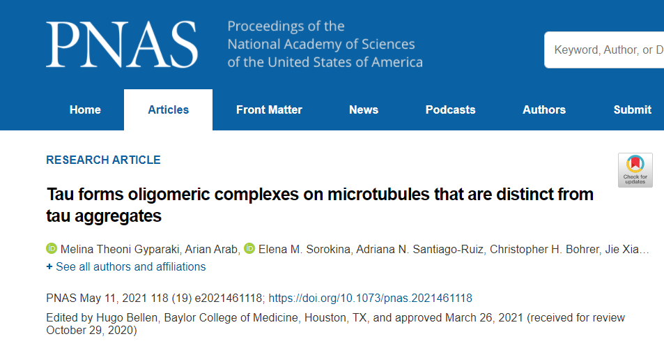 Melina Theoni Gyparaki, Arian Arab, Elena M. Sorokina, Adriana N. Santiago-Ruiz, Christopher H. Bohrer, Jie Xiao, Melike Lakadamyali. Tau forms oligomeric complexes on microtubules that are distinct from tau aggregates. Proceedings of the National Academy of Sciences, 2021; 118 (19): e2021461118 DOI: 10.1073/pnas.2021461118