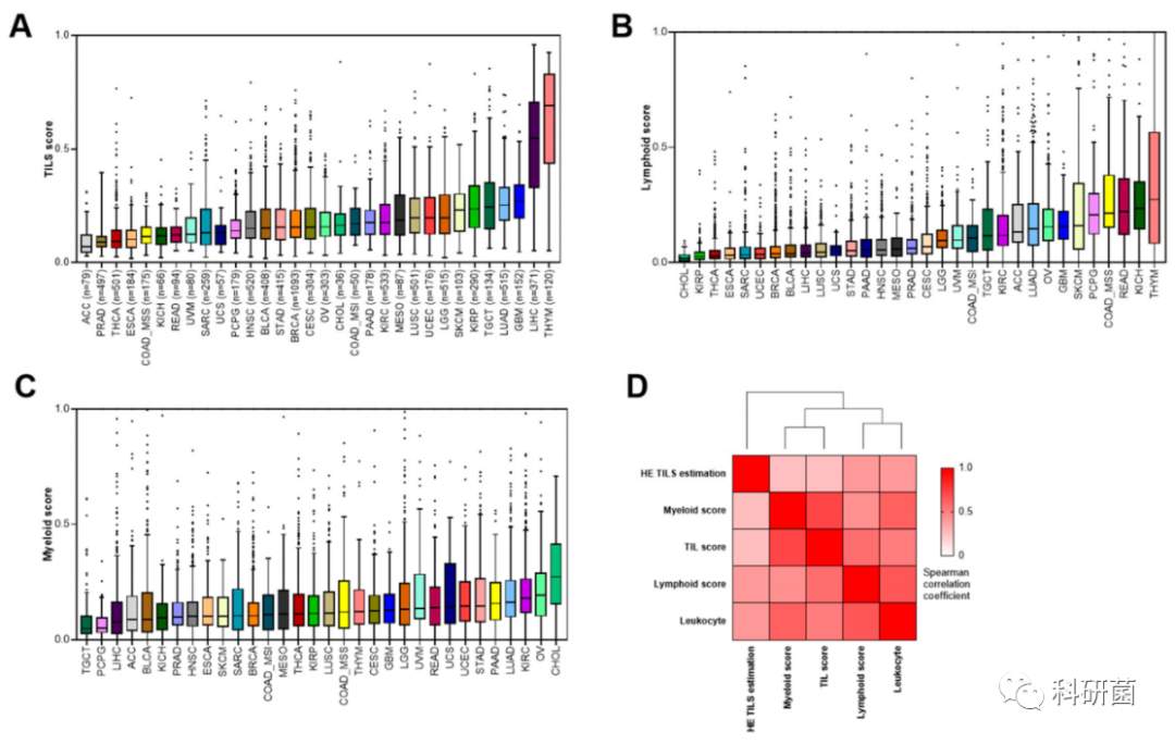 图1.A,B,C.TIL评分、淋系和髓系评分在TCGA泛癌队列中的情况(数据经过标准化);图1D.基于HE染色的TIL评分、淋系评分、髓系评分、基于基因signature的TIL评分以及白细胞评分之间的相关情况