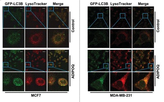 2017年,美国马里兰州巴尔的摩市约翰霍普金斯大学医学院的Seung J. Chung等人在《AUTOPHAGY》(IF11.1,生物1区)发表了题为“ADIPOQ/adiponectin induces cytotoxic autophagy in breast cancer cells through STK11/LKB1-mediated activation of the AMPK-ULK1 axis ”文章。本文研究数据揭示了脂联蛋白诱导乳腺癌细胞自噬性死亡,并为STK11/LKB1-AMPK-ULK1通路在脂联蛋白介导的细胞毒性自噬中的整合作用提供了体内外证据。新出现的证据表明自噬参与了乳腺癌的抑制。