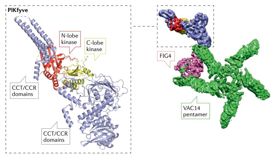 PIKfyve信号复合物的所有成分从酵母到人都是保守的,由蛋白质PIKfyve、骨架蛋白VAC14和双脂蛋白磷酸酶FIG4组成。Vac14和Fig4敲除小鼠会发生广泛的神经变性,伴有PI(3,5)P2水平降低和增大的囊泡。在患有神经退行性疾病:肌萎缩侧索硬化症(ALS)、原发性侧索硬化(PLS)和Charcot–Marie–Tooth 4J型疾病(CMT4J)的患者中发现了FIG4的突变。此外,在儿童早期发病的进行性神经疾病患者中发现VAC14中的双等位基因功能缺失突变。总之,证据表明,通过PIKfyve–FIG4–VAC14复合物的作用,PI(3,5)P2的产生对于神经系统组织的正常发育和维持至关重要。