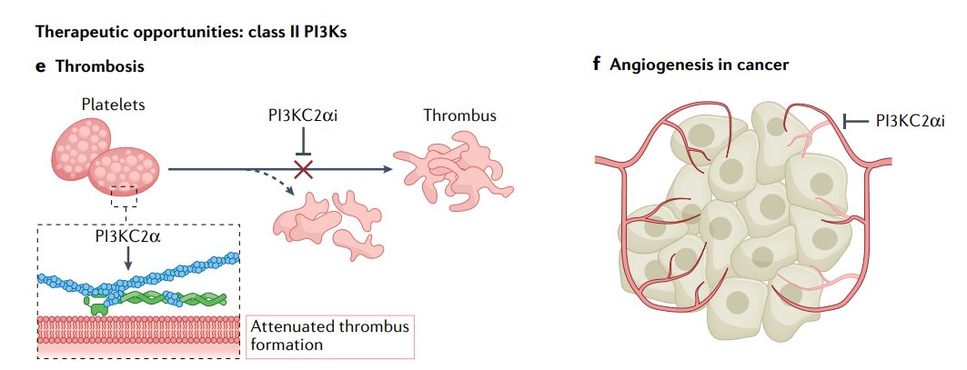 靶向PI3KC2已有相当多的遗传证据表明其具有治疗潜力。PI3KC2α作为抗血栓靶点的潜力非常诱人,对止血作用相对温和。PI3KC2α在癌症中的作用也已被证实。据报道,螺旋束结构域将PI3KC2α靶向有丝分裂纺锤体,在那里它与网格蛋白和TACC3组装以桥接动粒纤维。因此,癌细胞中PIK3C2A表达的缺失增加了非整倍体,并使癌细胞对基于微管的紫杉烷疗法敏感。此外,有迹象表明PI3KC2α在肿瘤血管生成中的作用。成年小鼠的内皮选择性PIK3C2A敲除抑制了肺癌和黑色素瘤模型的血管生成和肿瘤生长,揭示了PI3KC2α抑制剂的潜在治疗用途。
