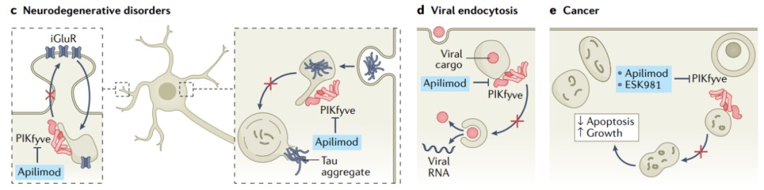 此外,PIKfyve也是抑制病毒感染和癌症治疗的靶点,其通过阻断溶酶体内运输阻断病毒进入宿主细胞细胞质,而一些筛选发现了PIKfyve抑制剂的抗癌活性。apilimod是一种高效和选择性的PIKfyve抑制剂,已显示出作为癌症和病毒感染治疗的前景,目前正在进行癌症和SARS-CoV2感染的临床试验。