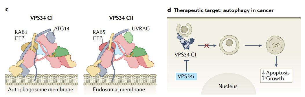VPS34 I型复合物在自噬中的中心作用使其成为治疗的靶点。巨自噬维持细胞内稳态,通常被认为在健康组织中具有肿瘤抑制作用。然而,一旦肿瘤形成,在压力和营养不良的肿瘤床中支持细胞存活的巨自噬能力导致该过程越来越促进肿瘤。