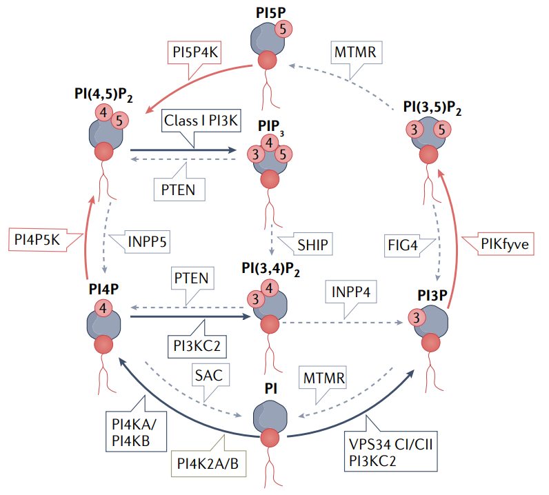 细胞膜中的脂质磷酸肌醇是无数膜信号事件的主要调节因子。磷酸肌醇在膜运输、代谢、生长、信号传导和自噬中起着核心作用,磷酸肌醇代谢的改变是许多人类疾病的原因。磷酸肌醇有七种不同的种类:三种单磷酸磷脂酰肌醇磷酸盐(PIPs)、三种双磷酸PIP2和一种三磷酸PIP3。