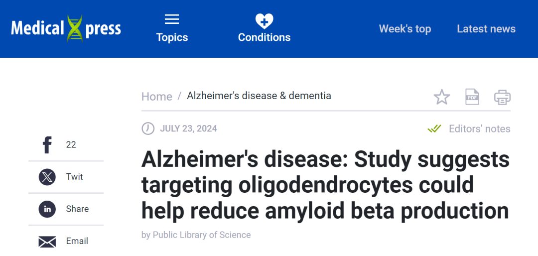 一项新研究表明,少突胶质细胞是 β-淀粉样蛋白的一个重要来源,并在阿尔茨海默病中促进神经元功能障碍方面发挥关键作用,而靶向少突胶质细胞有助于减少 β-淀粉样蛋白的产生。