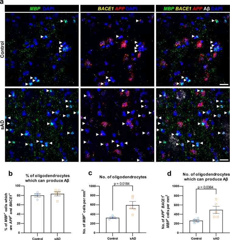 与对照组相比,人类散发性阿尔茨海默病(AD)大脑中具有产生Aβ能力的少突胶质细胞更多