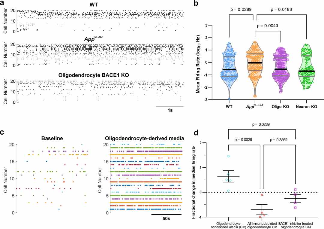 在AppNL-G-F阿尔茨海默病小鼠模型中,通过遗传手段抑制少突胶质细胞Aβ的产生可恢复神经元功能,而少突胶质细胞衍生的介质则会在体内促进神经元功能障碍