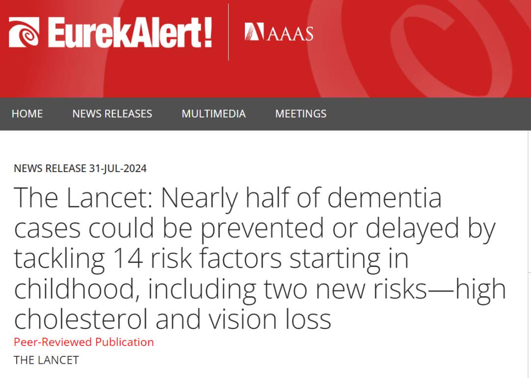 The Lancet: Nearly half of dementia cases could be prevented or delayed by tackling 14 risk factors starting in childhood, including two new risks—high cholesterol and vision loss