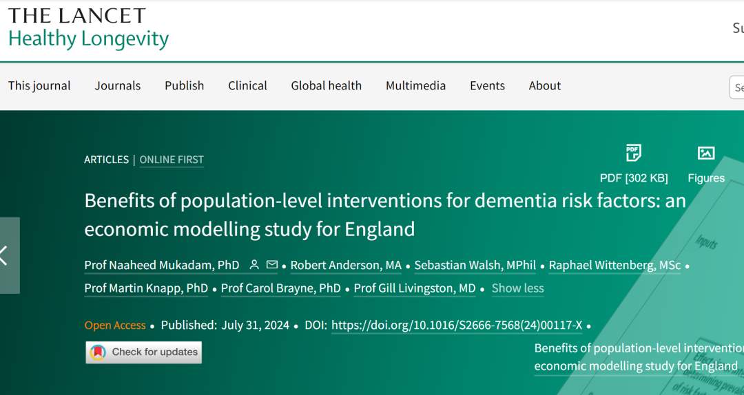[2].Benefits of population-level interventions for dementia risk factors: an economic modelling study for England, The Lancet Healthy Longevity (2024). DOI: 10.1016/S2666-7568(24)00117-X