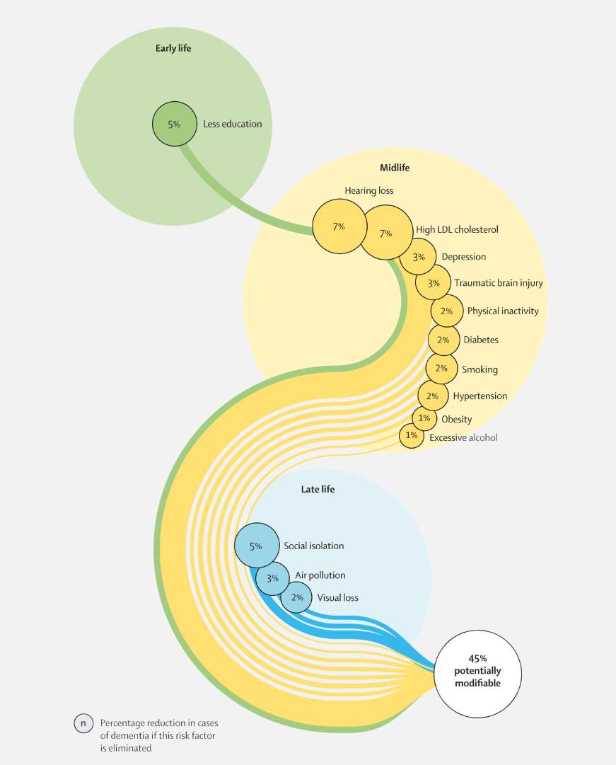 新报告估计,在全球人口中,与失智症发病比例最高的风险因素是听力障碍和高 LDL 胆固醇(各占7%),以及早年教育水平低和晚年社会隔离(各占5%)。