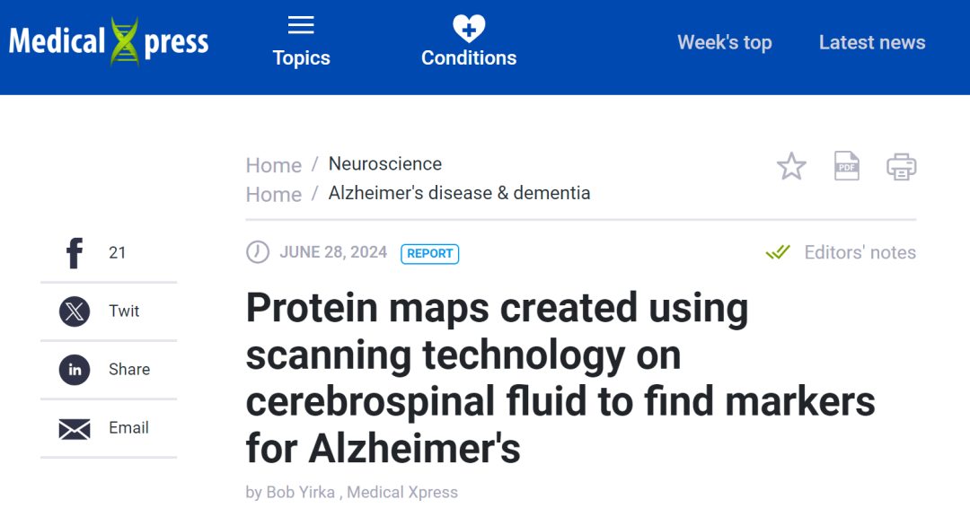 原文标题 : 通过使用脑脊液扫描技术创建的蛋白质图谱来寻找阿尔茨海默病的标志物