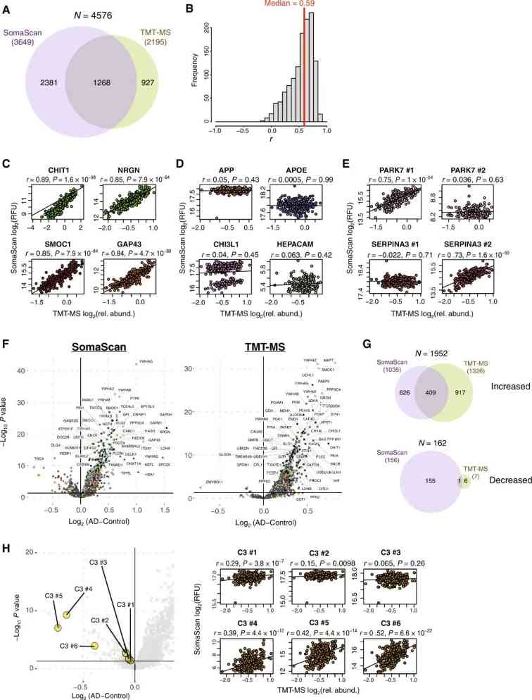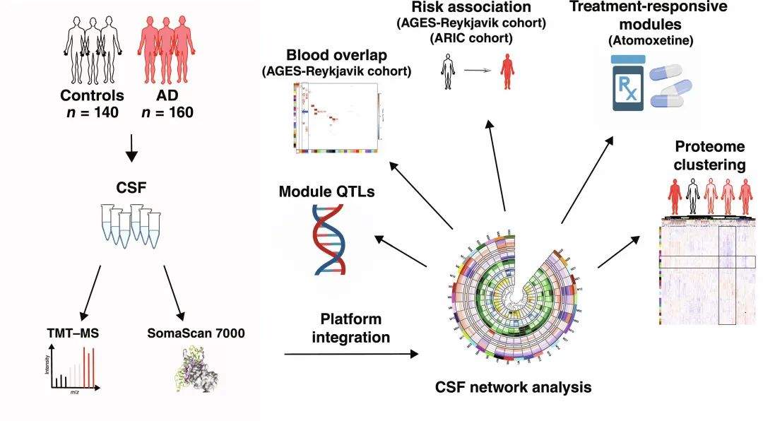研究人员从 160 名处于阿尔茨海默病不同发展阶段的人那里获取了数千份脑脊液样本。然后,他们使用串联质谱标签(Tandem Mass Tag,TMT)质谱法对所有样本进行扫描,并使用 SomaLogic 公司改良的基于适配体的 SomaScan 7000 检测法进行分析,为每个样本创建特征图谱,然后将它们相互比较。