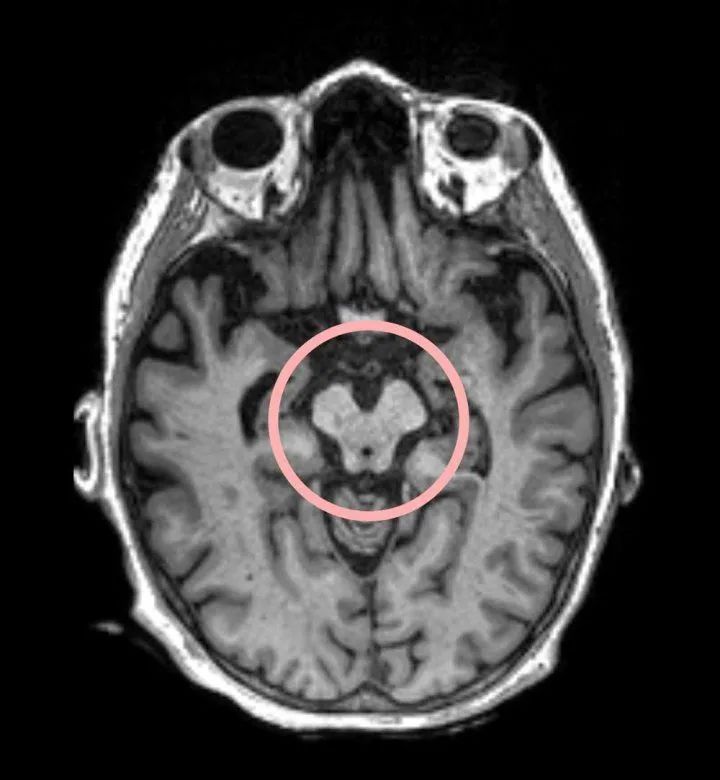 脑部扫描显示红色圆圈区域存在进行性核上性麻痹