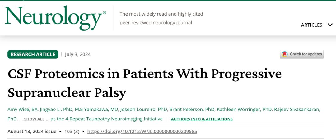 Amy Wise, Jingyao Li, Mai Yamakawa, Joseph Loureiro, Brant Peterson, Kathleen Worringer, Rajeev Sivasankaran, Jose-Alberto Palma, Laura Mitic, Hilary W. Heuer, Argentina Lario-Lago, Adam M. Staffaroni, Annie Clark, Jack Taylor, Peter A. Ljubenkov, Lawren Vandevrede, Lea T. Grinberg, Salvatore Spina, William W. Seeley, Bruce L. Miller, Bradley F. Boeve, Bradford C. Dickerson, Murray Grossman, Irene Litvan, Alexander Pantelyat, Maria Carmela Tartaglia, Zihan Zhang, Anne-Marie A. Wills, Jessica Rexach, Julio C. Rojas, Adam L. Boxer. CSF Proteomics in Patients With Progressive Supranuclear Palsy. Neurology, 2024; 103 (3) DOI: 10.1212/WNL.0000000000209585