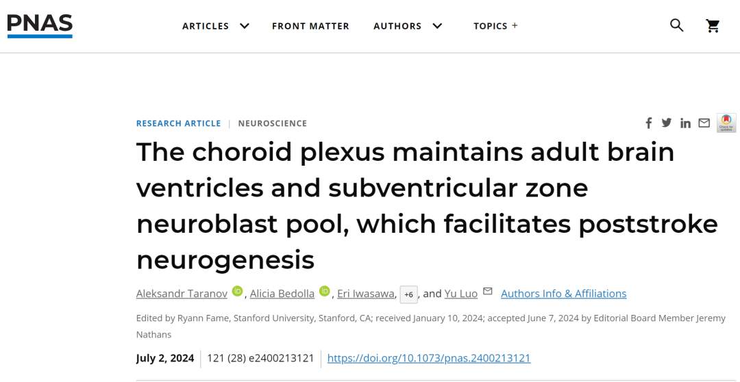Aleksandr Taranov, Alicia Bedolla, Eri Iwasawa, Farrah N. Brown, Sarah Baumgartner, Elizabeth M. Fugate, Joel Levoy, Steven A. Crone, June Goto, Yu Luo. The choroid plexus maintains adult brain ventricles and subventricular zone neuroblast pool, which facilitates poststroke neurogenesis. Proceedings of the National Academy of Sciences, 2024; 121 (28) DOI: 10.1073/pnas.2400213121